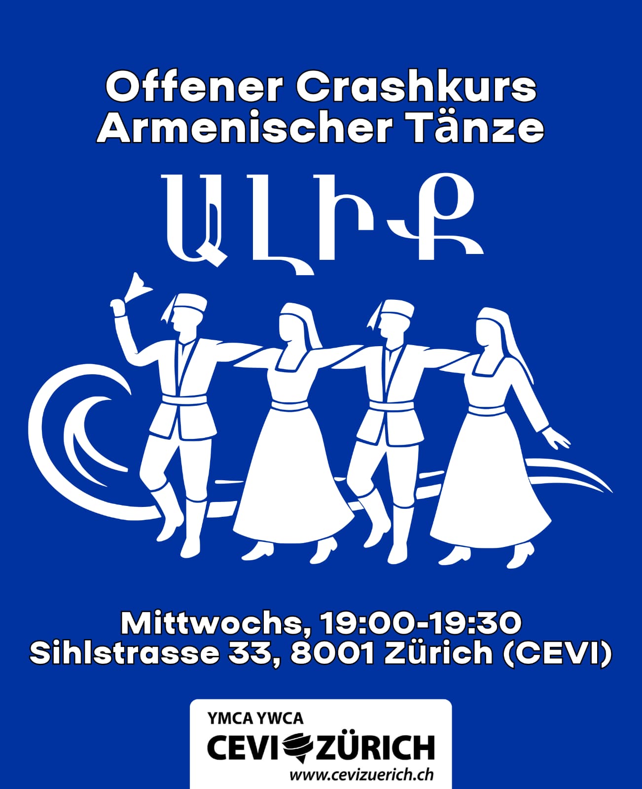 Es freut uns sehr, euch zu einem neuen Angebot bei uns im Haus einzuladen: Ein offener Tanzkurs für Armenische Tänze. Unter der fachkundigen Leitung von Murad Akobjan könnt ihr erste Schritte in armenischen Tänzen machen oder eure Kenntnisse auffrischen. Das Angebot startet per sofort jeweils Mittwochs von 19.00 bis 19.30 Uhr im Saal Zürich (Mehrzweckhalle) bei uns im Cevi-Zentrum Glockenhof an der Sihlstrasse 33. Im Anhang senden wir euch den Flyer dazu.